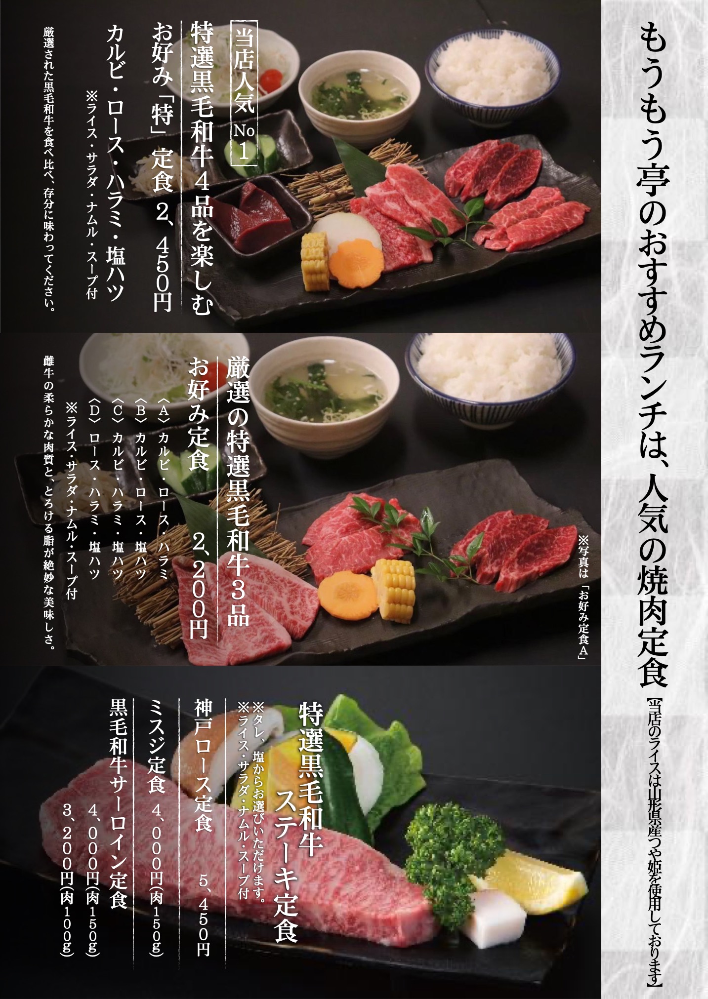 もうもう亭のランチはお得な定食をはじめ、合計22種類のお食事メニューをお愉しみ頂けます。